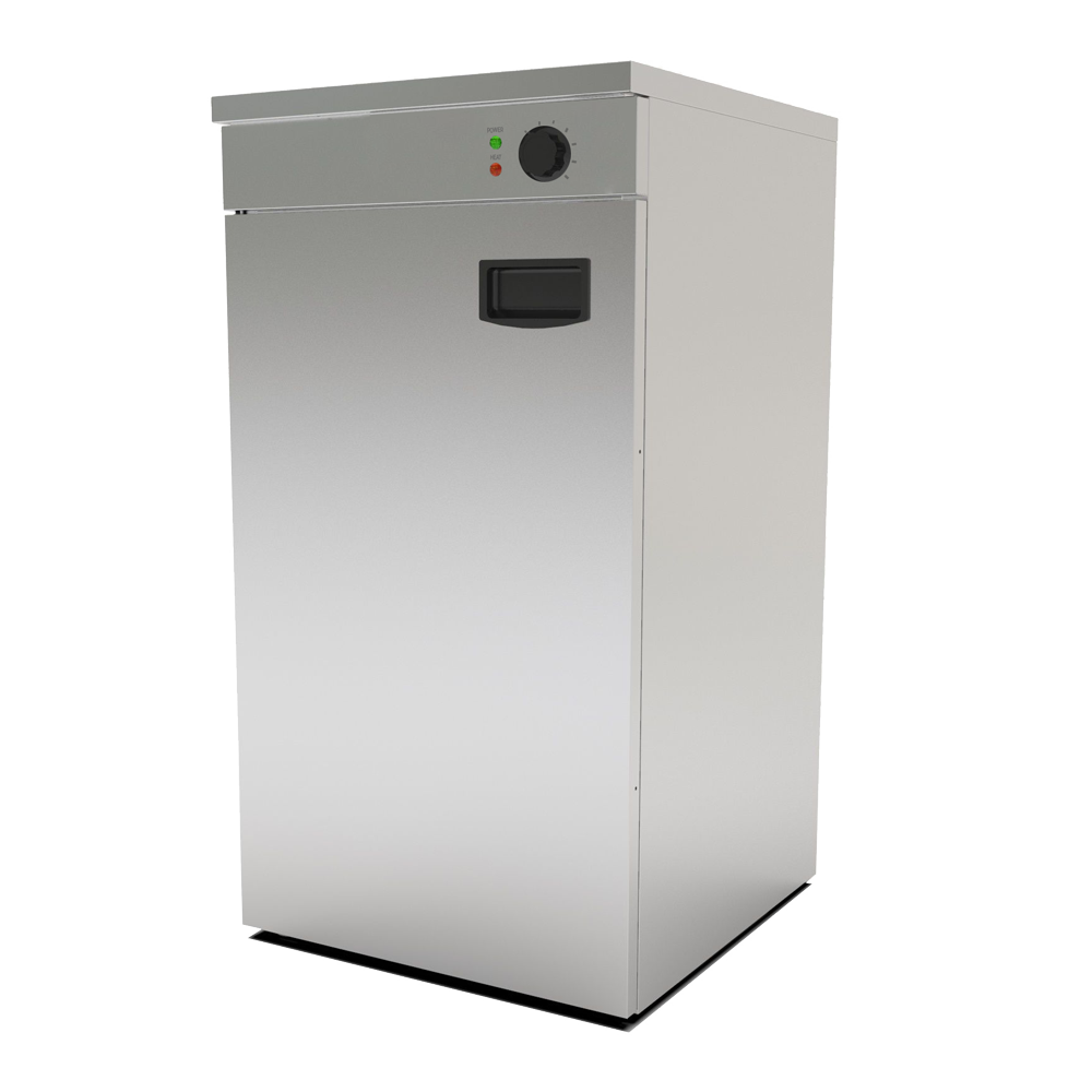 • Plate warming cabinet made of stainless steel with internal fan for better heat distribution. Suitable for approximately 45 to 60 plates with a diameter of 32 centimeters, the temperature is adjustable between 30 and 85 degrees.