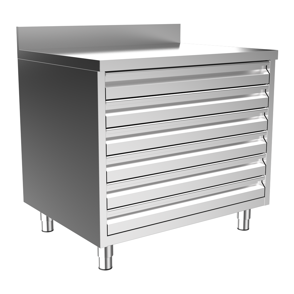 • Brushed structure stainless steel AISI 430 • With upstand / 6S model • Working surface reinforced with MDF (sound proof) • With 6 drawers for Pizza dough boxes (600x400mm) 100MM • Stainless steel legs adjustable in height