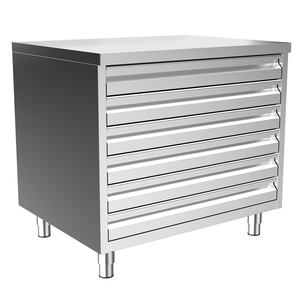 • Paslanmaz Çelik AISI 430’dan üretilmiştir • Ayaklı / 6S modeli • MDF ile güçlendirilmiş çalışma yüzeyi (ses geçirmez) • Pizza hamur kutuları için 6 çekmeceli (600x400mm) 100MM • Yüksekliği ayarlanabilen paslanmaz çelik ayaklar